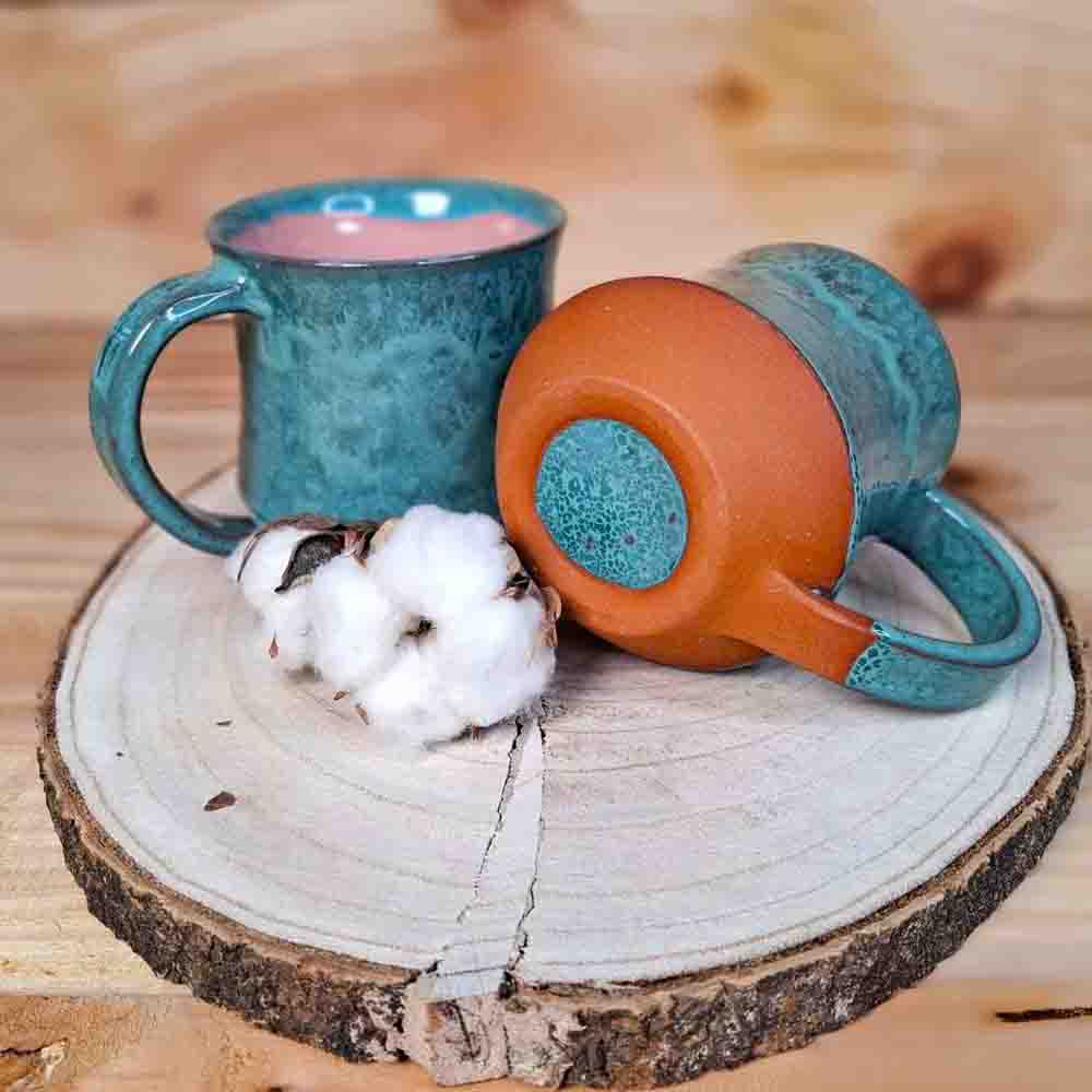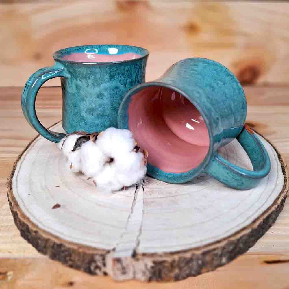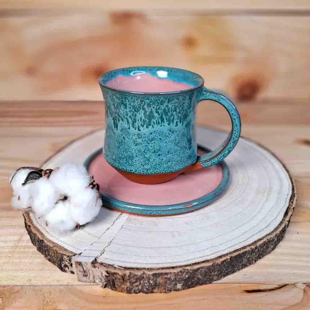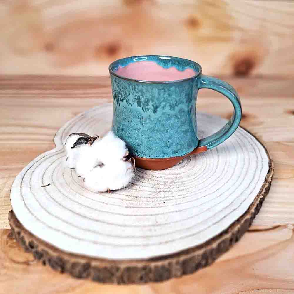 Zunanjost skodelice je prevlečena z zeleno glazuro z variacijami v tonu, notranjost pa je v topli rožnati barvi.