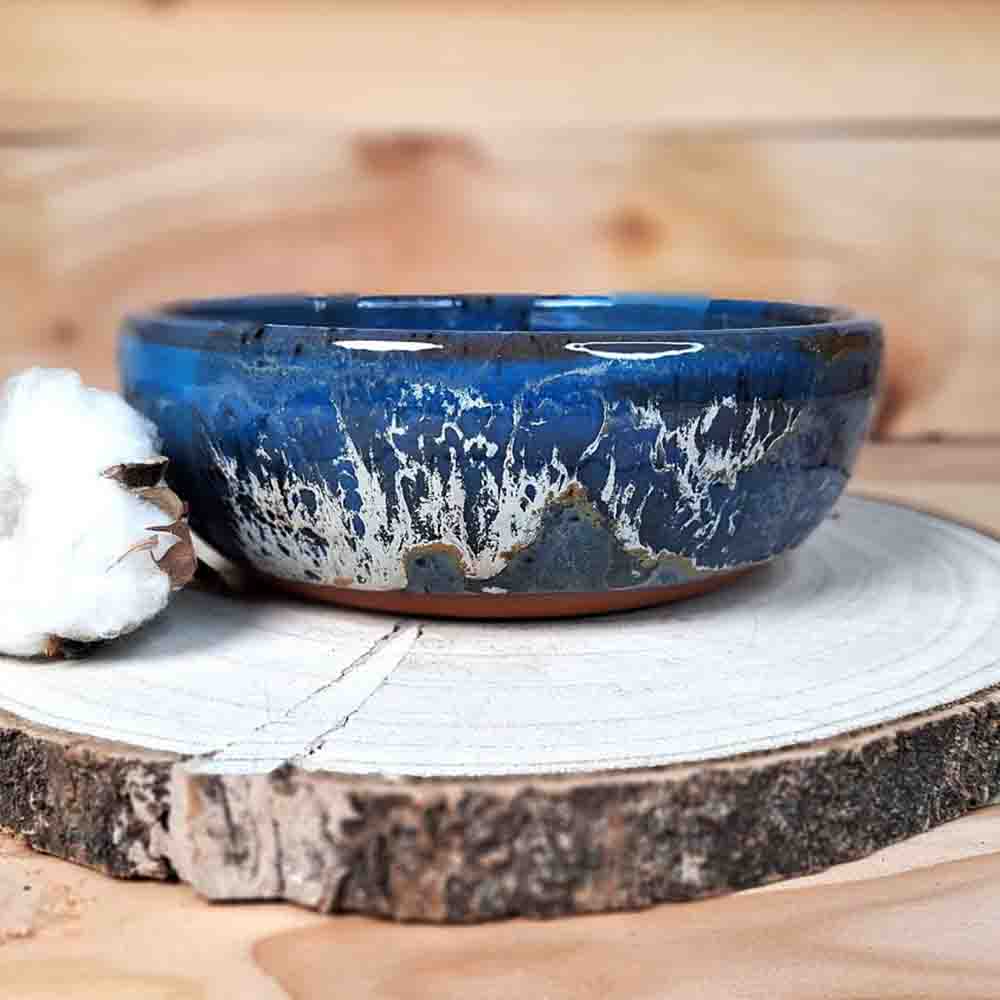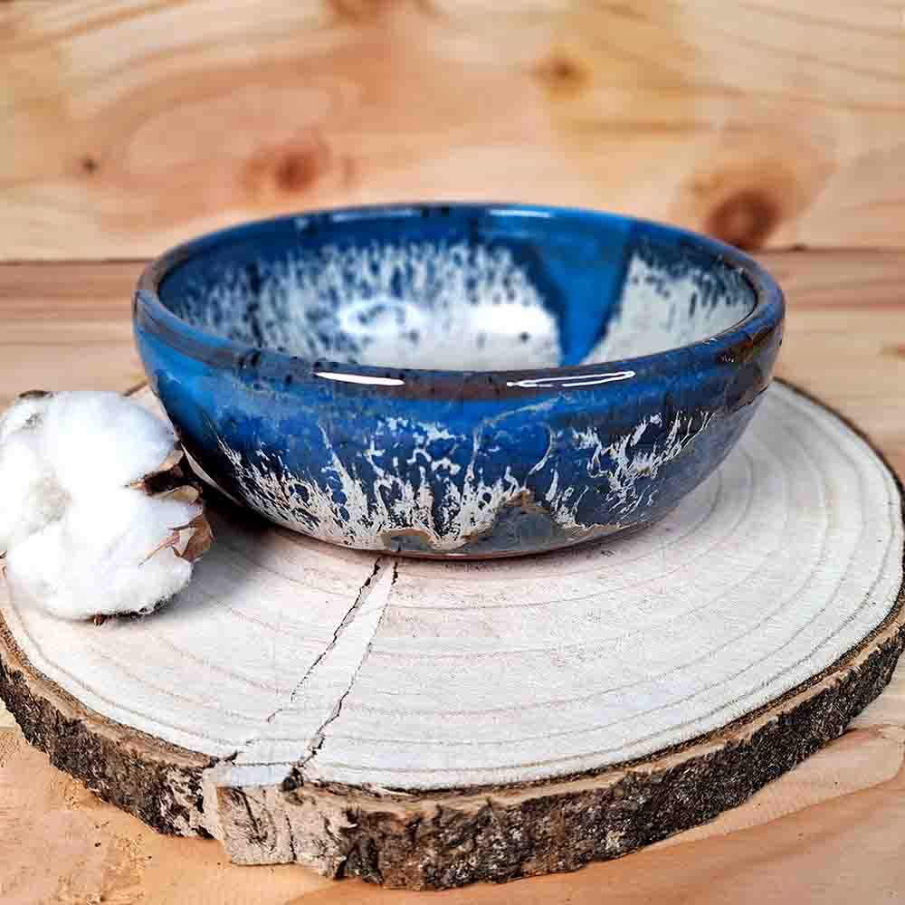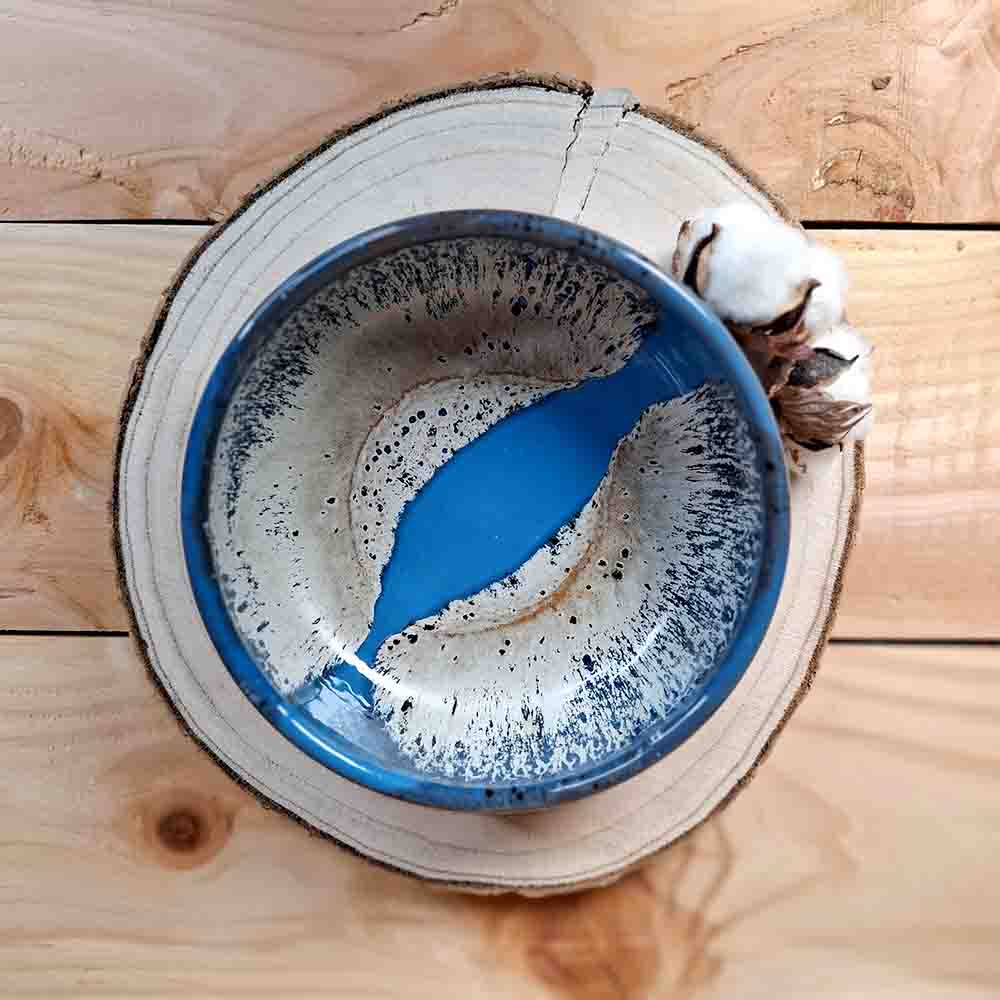 Glazure so nanešene tako, da se prelivajo iz rjave v srebrno in nebeško modro barvo. Vsaka skledica pride iz peči drugačna, za kar poskrbijo efekt glazure.