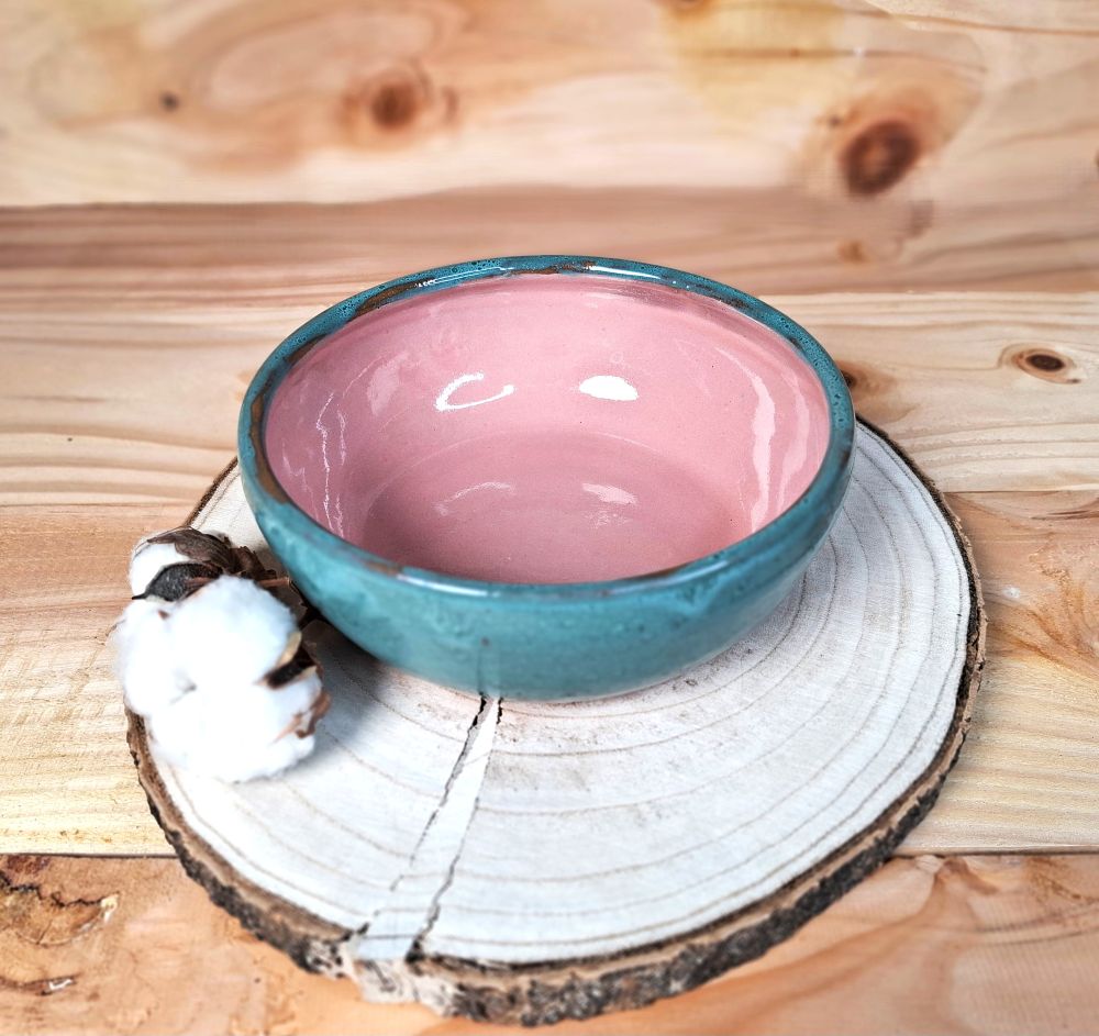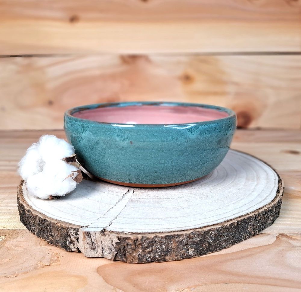 Zunanjost skledice je prevlečena z zeleno glazuro z variacijami v tonu, notranjost pa je v topli rožnati barvi. Skledica deluje rustikalno, a hkrati prefinjeno, kar jo naredi idealno za vsakdanjo uporabo.